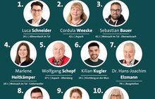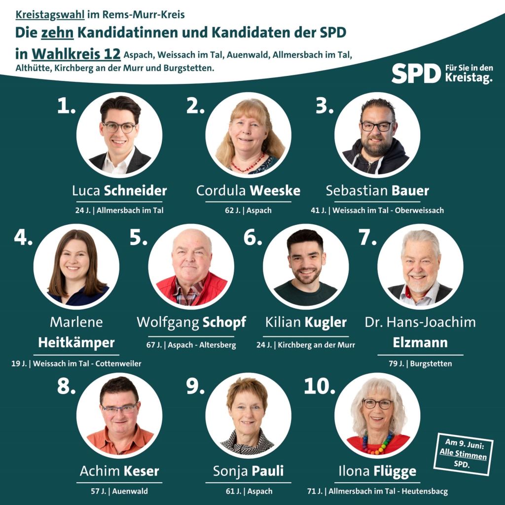 Die Liste wird angeführt vom selbständigen Garten- und Landschaftsbauer Dietmar Schönberger (SPD) und dem Rettungssanitäter Sebastian Bauer (SPD). Auf Platz 3 kandidiert die Studentin Marlene Heitkämper (SPD) auf Platz 4 der Landschaftsplaner Jan Hutzenlaub und auf Platz 5 der Vertriebsingenieur Daniel Leibold. Weiter kandidieren auf der offenen SPD-Liste die Bankangestellte Elvira Stampfl-Oppl (SPD), der Oberstudienrat i.R. Hans-Uwe Schilling (SPD), der Diplomingenieur Hannes Lohrmann, die Bankkaufrau Marlene Uitz-Frey (SPD), der Geschäftsführer Lukas Wildermuth (SPD), der Wirtschaftsingenieur Marco Lösch (SPD), die Realschullehrerin i.R. Renate Flik, der Rentner und frühere Energiegeräteelektroniker Uwe Grünitz (SPD), der Ingenieur Dr. Andreas Wahl, der Schreiner Jens Leiensetter, der Senior Controller Hilmar Schmidt (SPD), der Realschullehrer i,R. Alfred Herold und die Rentnerin Anneliese Senss (SPD).