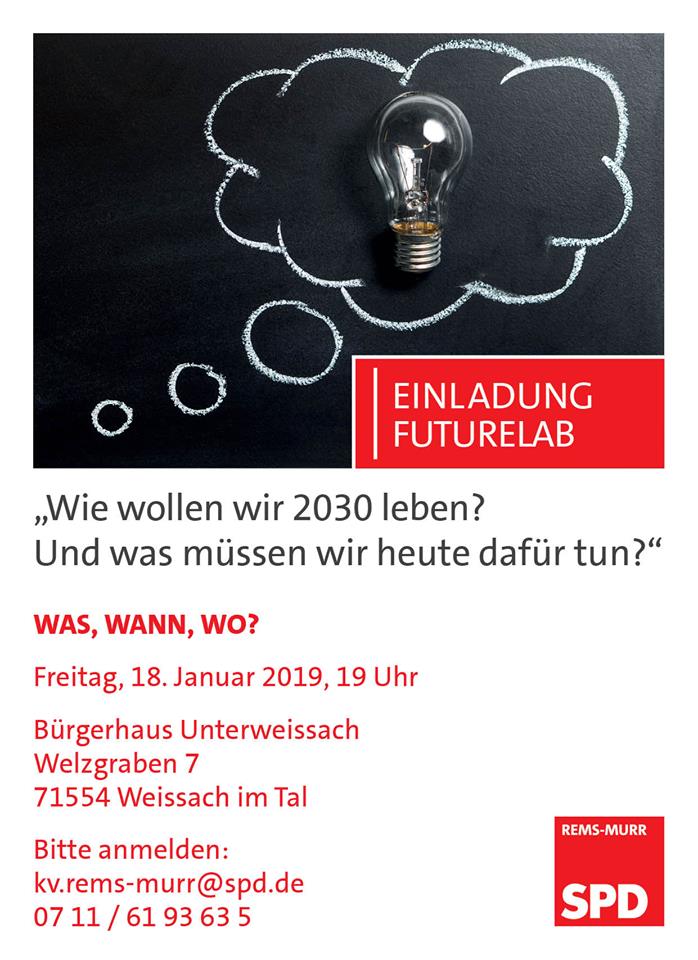Die SPD-Rems-Murr will am 18. Januar 2019 in einem FutureLab (ZukunftsLabor) die Grundlagen für ihre Wahlaussagen erarbeiten. Es wird dabei darum gehen, Vorstellungen zu formulieren, wie wir uns das Leben 2030 vorstellen und was wir heute dafür tun müssen.
