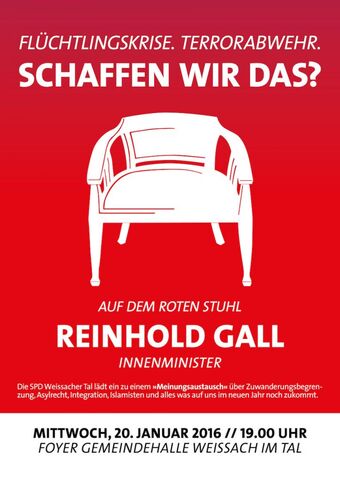 "Terrorabwehr und Flüchtlingswelle -schaffen wir das?" - 40. Roter Stuhl mit Innenminster Reinhold Gall