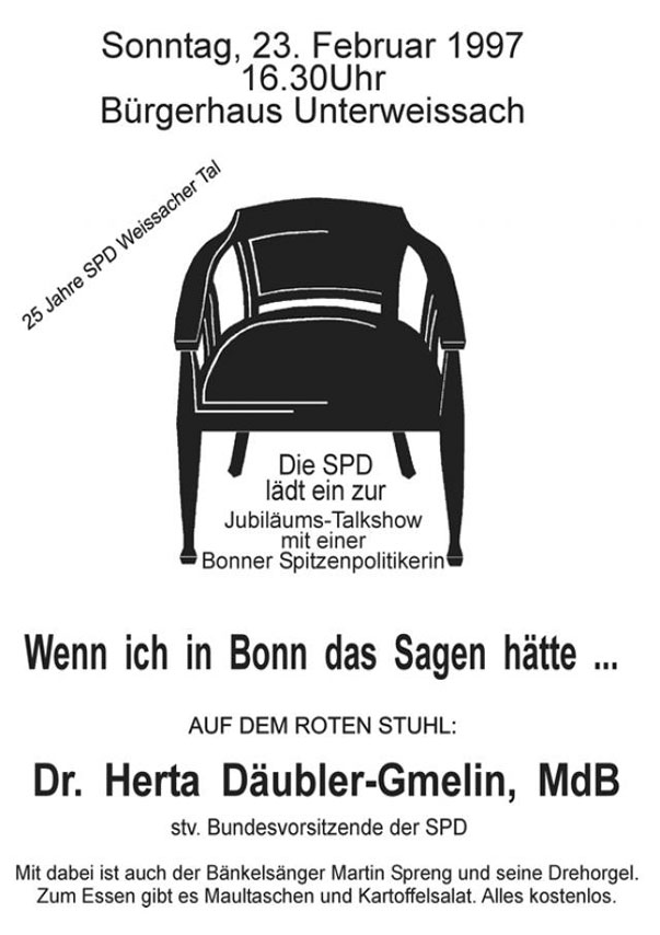 selbstgemachtes Bänkellied für Herta, Video-Umfrage, alte Wahlplakate, rund 250 Besucher, Jubiläumsfeier des OV Weissacher Tal (25 Jahre!)
