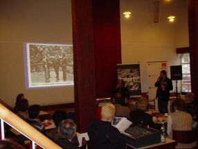 Power-point-Präsentation über Felix Huby, Leserfragen, rund 100 Besucher, Lesung, Büchertisch