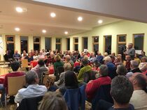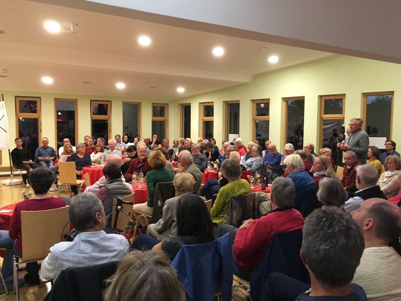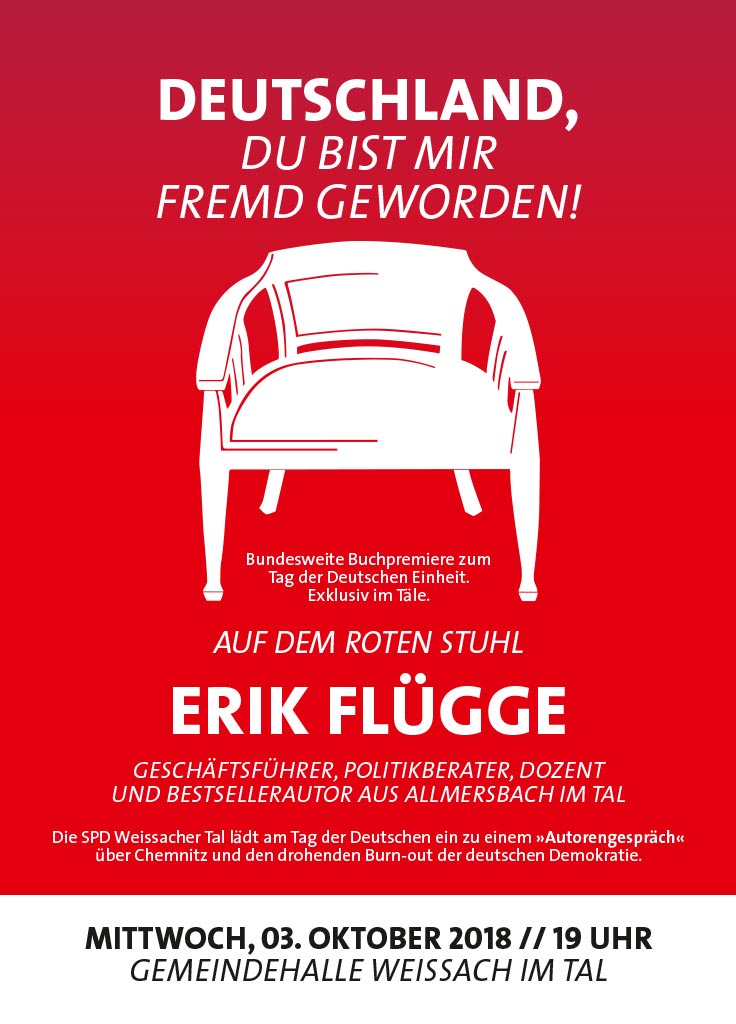 Für den in Allmersbach im Tal aufgewachsenen Ehrengast war es ein Heimspiel. Rund 120 Besucher waren gekommen, um mit Erik Flügge über das nicht nur ihm fremd gewordene Deutschland zu diskutieren. Passend zum Tag der deutschen Einheit ware neben dem Roten Stuhl eine Deutschlandpuppe zwischen zwei Protestplakaten aufgebaut.