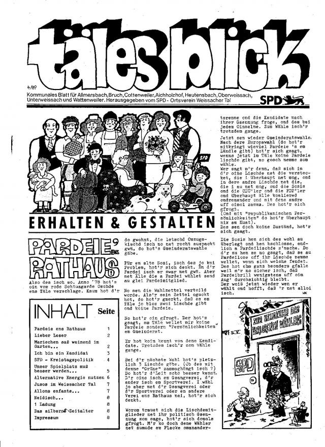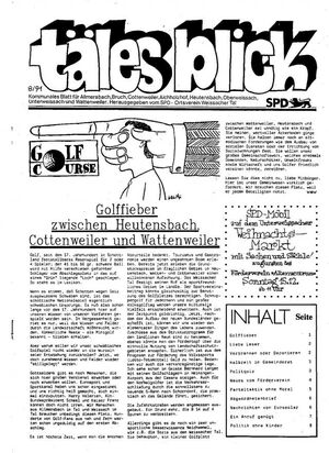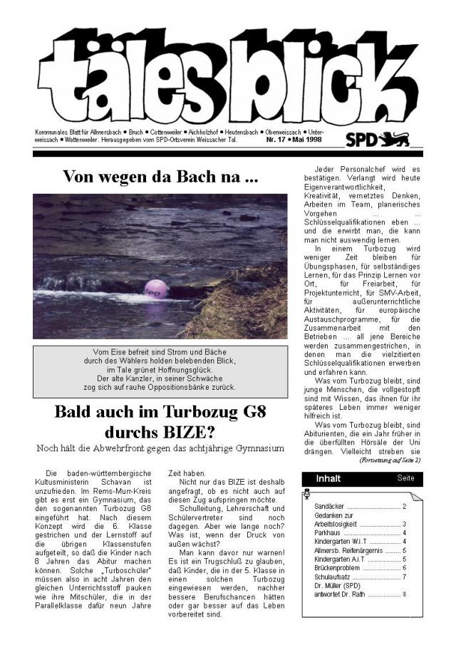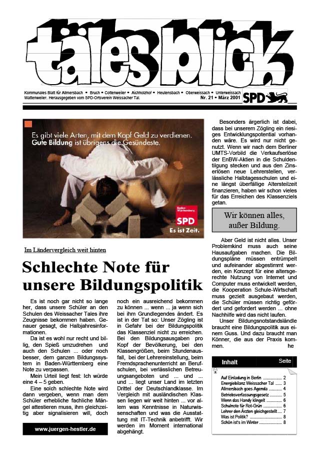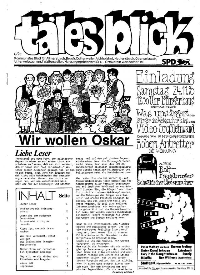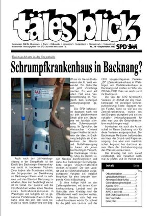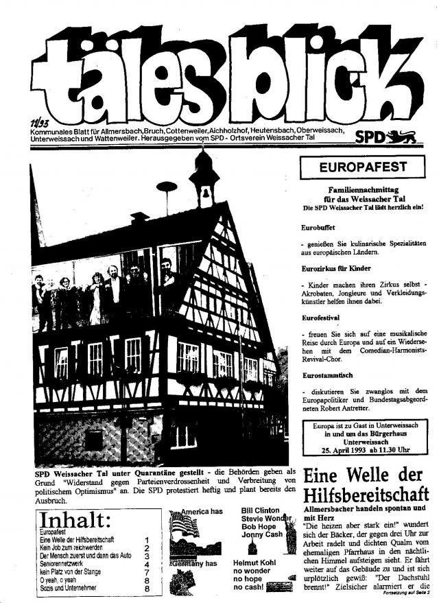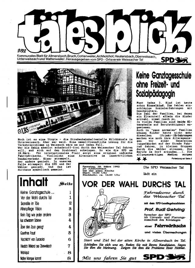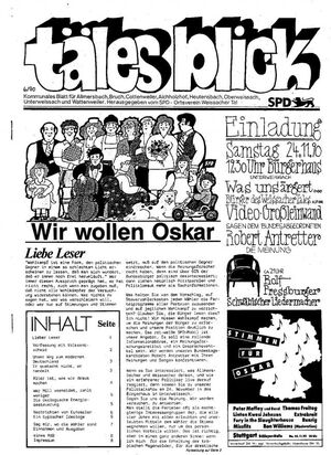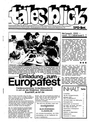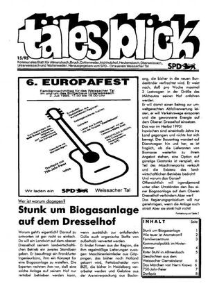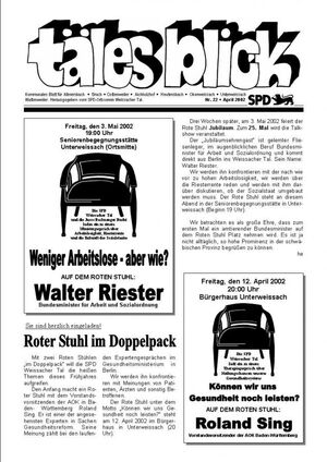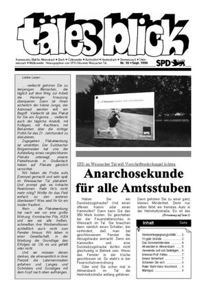 Politische Willensbildung lebt von der Meinungsvielfalt. Wir waren der Meinung, die Positionen der SPD Weissacher Tal müssen hör- und lesbar sein. Deshalb haben wir vor 25 Jahren eine Ortsvereinszeitung gegründet und sie "Tälesblick" genannt. Inzwischen sind 28 Ausgaben erschienen. Die letzte liegt allerdings schon ein paar Jahre zurück. Es ist nicht so, dass wir nichts mehr zu sagen hätten. Ganz im Gegenteil. Aber die Zeiten haben sich geändert. Wir leben im Internetzeitalter. Printmedien verlieren an Bedeutung. Außerdem sind wir zu wenige, um regelmäßig und flächendeckend insgesamt 6000 Zeitungen in die Briefkästen zu werfen. Und das Geld für professionelle Austräger haben wir nicht.