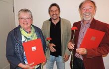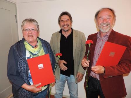 Rüdiger Frey (rechts) ist seit 40 Jahren Mitglied der SPD, Traudel Heinkel (links im Bild) und Uschi Krupkat (nicht im Bild) sind seit 25 Jahren dabei. Bei der Mitgliederversammlung wurden sie dafür geehrt. Unterschrieben sind die Urkunden vom Bundesvorsitzenden Sigmar Gabriel, vom Landesvorsitzenden Nils Schmid und vom Orts- und Kreisvorsitzenden Jürgen Hestler (auf dem Bild mitte).