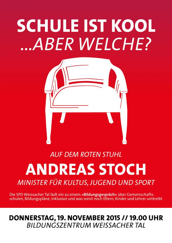 Der Kultusminister des Landes Andreas Stoch wird als 39. Ehrengast auf dem Roten Stuhl der SPD Weissacher Tal Platz nehmen. Die Polittalkshow findet statt am 19. November 2015 um 19 Uhr im Bildungszentrum Weissacher Tal.