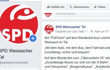 Seit dem 14. April 19 ist die SPD Weissacher Tal auch auf Facebook präsent. Es wird gepostet. Vor allem über Themen im Zusammenhang mit der Gemeinderatswahl, über die Kandidatinnen und Kandidaten der SPD, über SPD-Veranstaltungen, über Persönliches und auch über Belangloses. So eine typische Facebook-Seite halt.