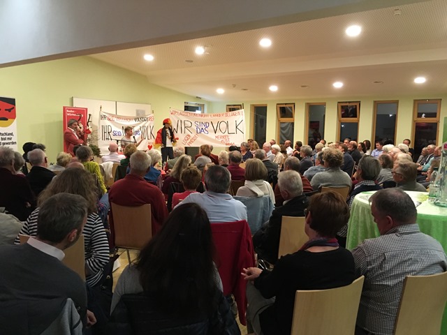 Ein Bühnenbild im Foyer der Gemeindehalle Unterweissach zeigt die gegenwärtige Zerrissenheit der deutschen Gesellschaft anhand zweier Plakate – eines pro, ein anderes kontra AfD: „Ihr seid vielleicht völkisch, aber ihr seid nicht das Volk.“ Davor befand sich die einen deutschen Fußballfan darstellende lebensgroße Puppe in voller Montur – Schwarz-Rot-Gold von Kopf bis Fuß also.