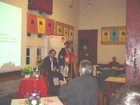 Power-point-Präsentation über Erwin Staudt, rund 100 Besucher, Meinungsumfragen beim Publikum per Kartenzeichen