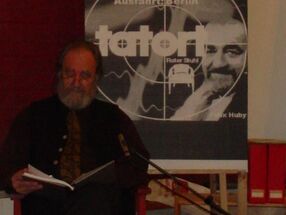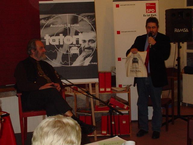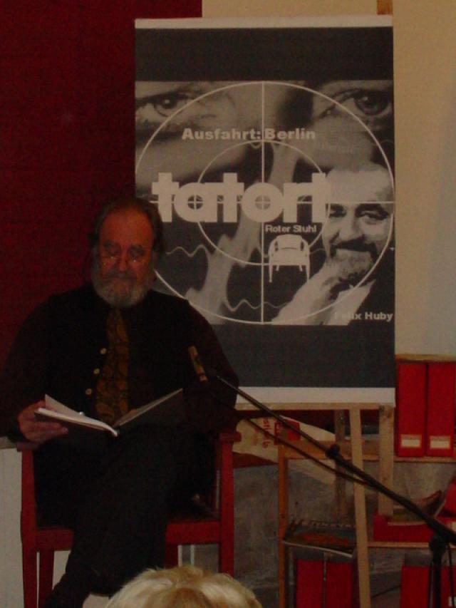 Power-point-Präsentation über Felix Huby, Leserfragen, rund 100 Besucher, Lesung, Büchertisch