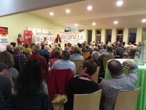 Für den in Allmersbach im Tal aufgewachsenen Ehrengast war es ein Heimspiel. Rund 120 Besucher waren gekommen, um mit Erik Flügge über das nicht nur ihm fremd gewordene Deutschland zu diskutieren. Passend zum Tag der deutschen Einheit ware neben dem Roten Stuhl eine Deutschlandpuppe zwischen zwei Protestplakaten aufgebaut.