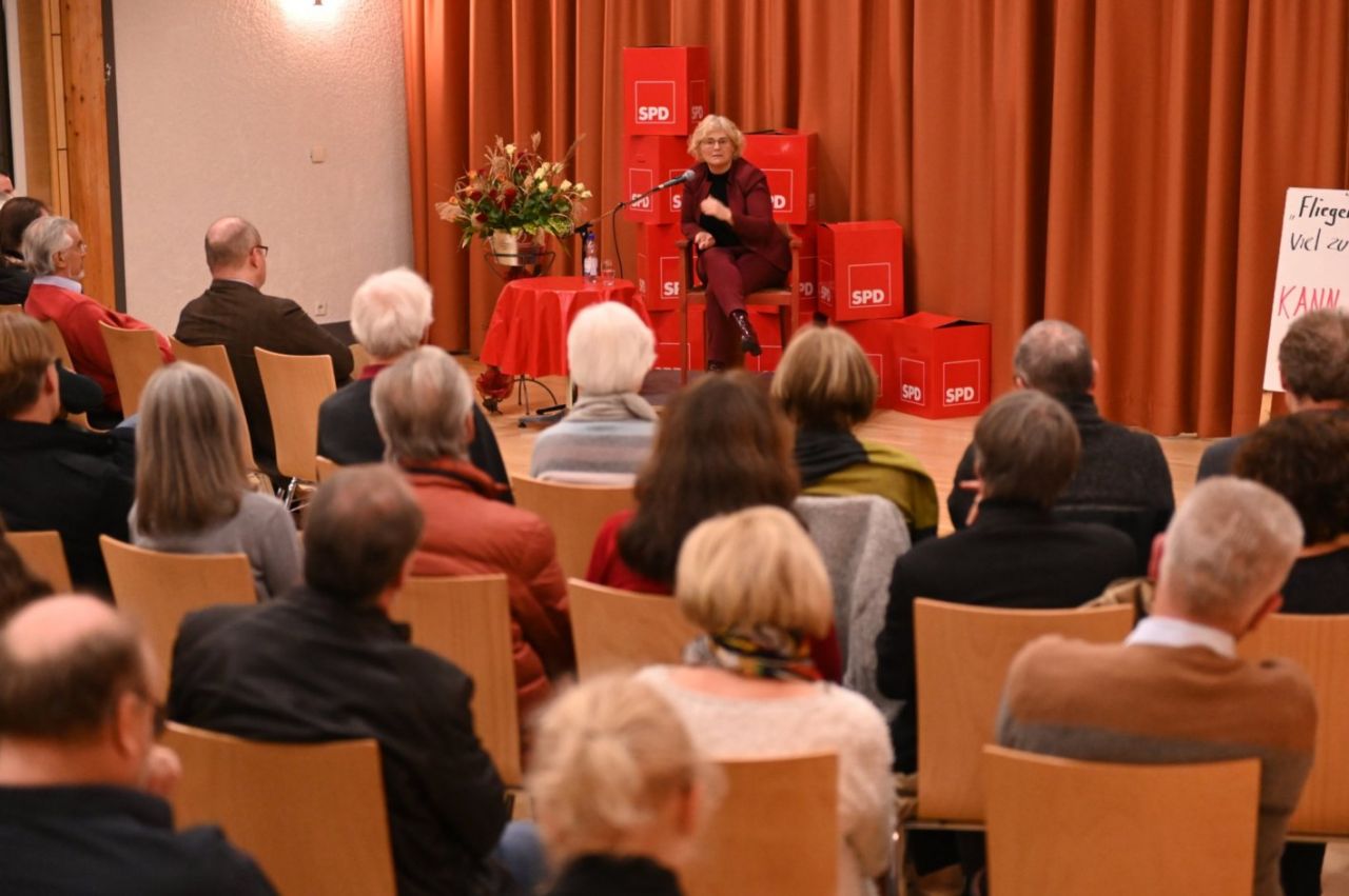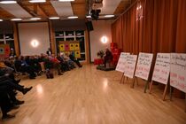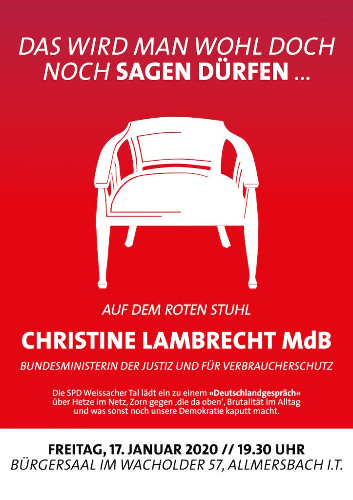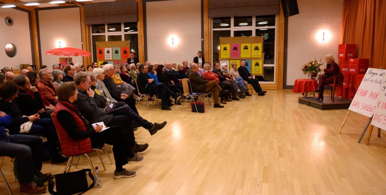 Aufmacher war die Aufregung um die Satire "Unsere Oma ist ne alte Umweltsau". Rund 100 Besucher waren gekommen, um mit der Justizministerin über "Hatespeech" und die Verrohung der Sprache zu diskutieren. Plakative Parolen auf alten Plakatständern gaben die notwendigen Gesprächsimpulse.
