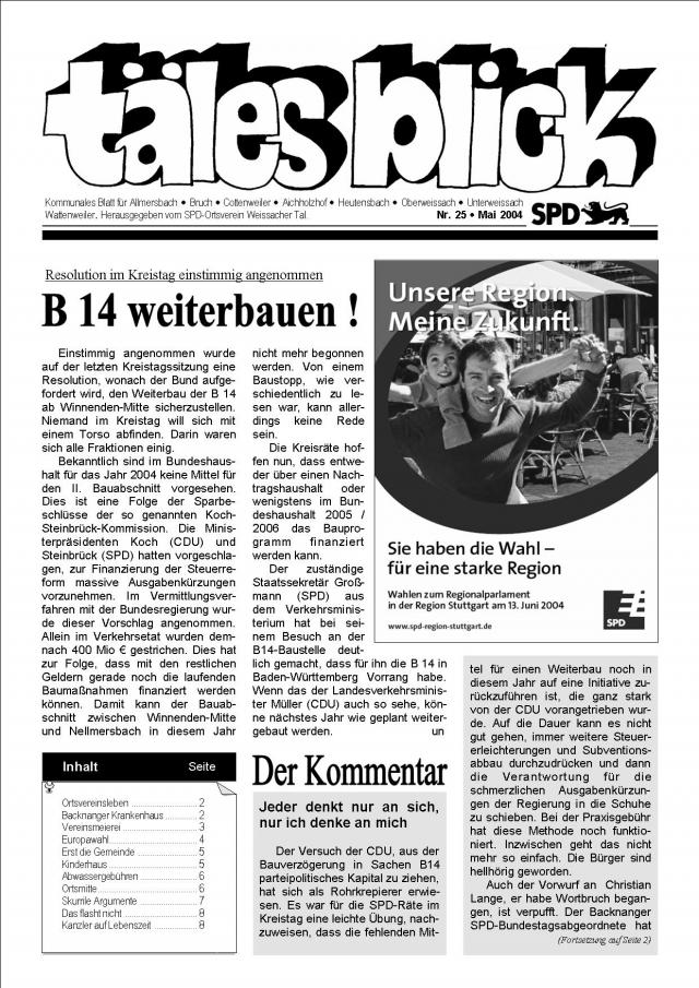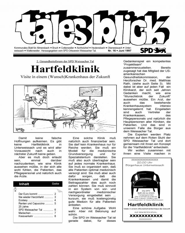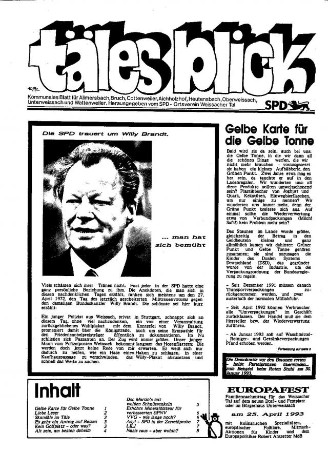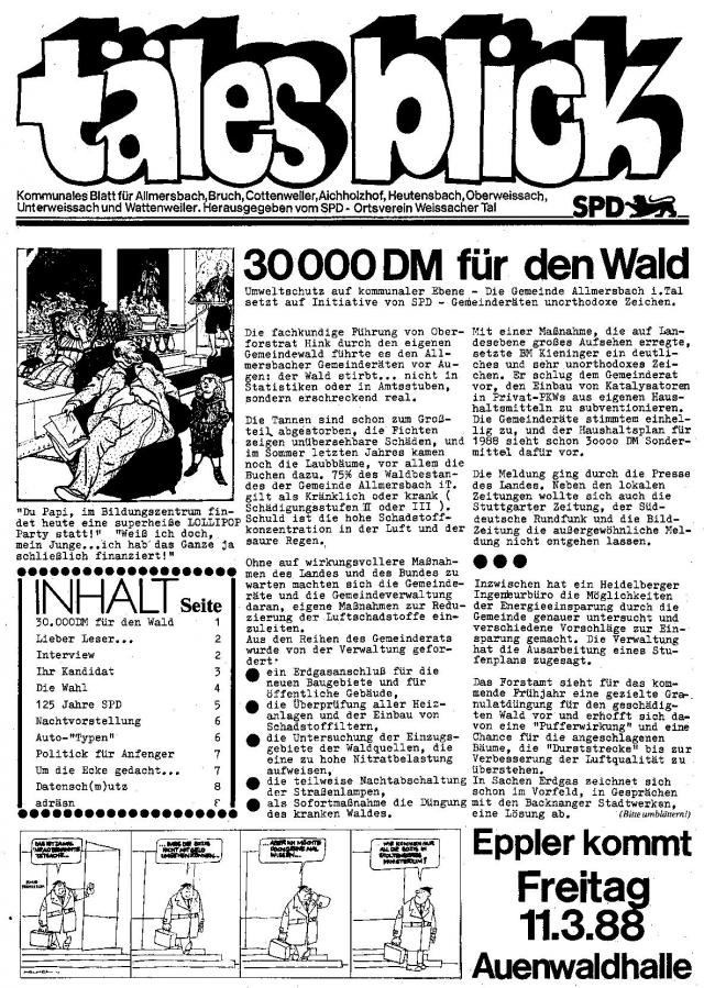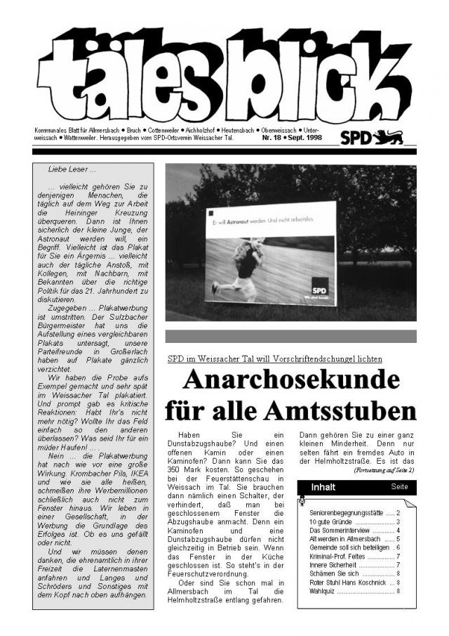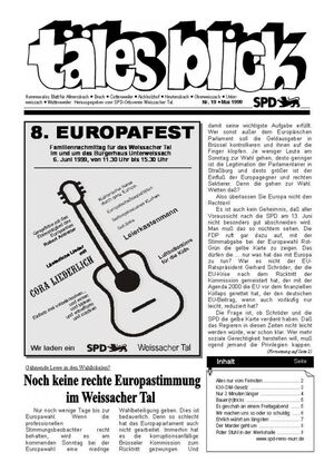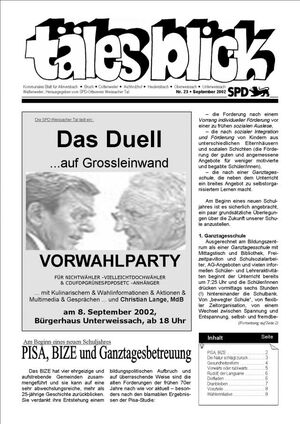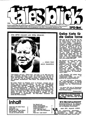 Politische Willensbildung lebt von der Meinungsvielfalt. Wir waren der Meinung, die Positionen der SPD Weissacher Tal müssen hör- und lesbar sein. Deshalb haben wir vor 25 Jahren eine Ortsvereinszeitung gegründet und sie "Tälesblick" genannt. Inzwischen sind 28 Ausgaben erschienen. Die letzte liegt allerdings schon ein paar Jahre zurück. Es ist nicht so, dass wir nichts mehr zu sagen hätten. Ganz im Gegenteil. Aber die Zeiten haben sich geändert. Wir leben im Internetzeitalter. Printmedien verlieren an Bedeutung. Außerdem sind wir zu wenige, um regelmäßig und flächendeckend insgesamt 6000 Zeitungen in die Briefkästen zu werfen. Und das Geld für professionelle Austräger haben wir nicht.