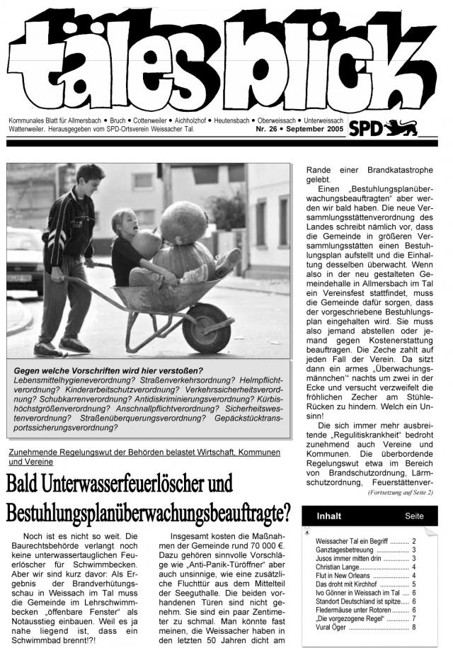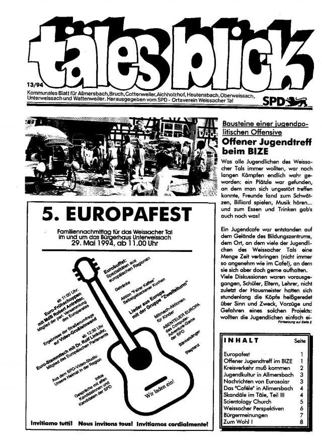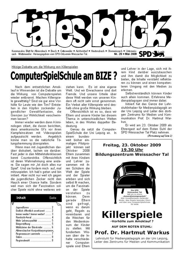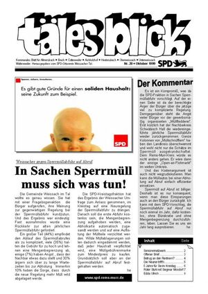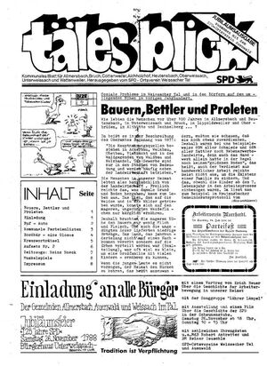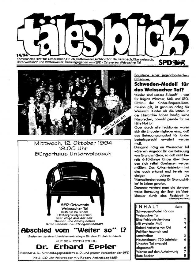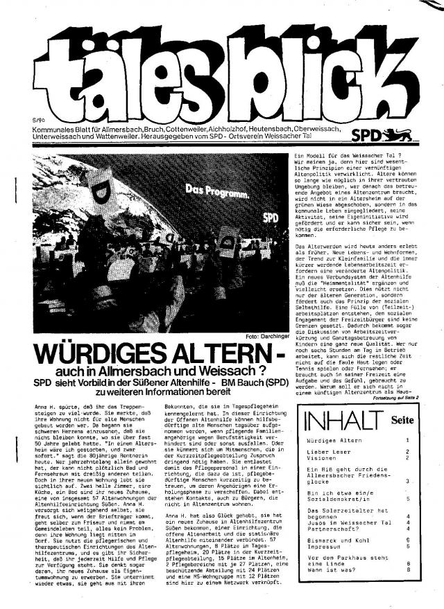 Politische Willensbildung lebt von der Meinungsvielfalt. Wir waren der Meinung, die Positionen der SPD Weissacher Tal müssen hör- und lesbar sein. Deshalb haben wir vor 25 Jahren eine Ortsvereinszeitung gegründet und sie "Tälesblick" genannt. Inzwischen sind 28 Ausgaben erschienen. Die letzte liegt allerdings schon ein paar Jahre zurück. Es ist nicht so, dass wir nichts mehr zu sagen hätten. Ganz im Gegenteil. Aber die Zeiten haben sich geändert. Wir leben im Internetzeitalter. Printmedien verlieren an Bedeutung. Außerdem sind wir zu wenige, um regelmäßig und flächendeckend insgesamt 6000 Zeitungen in die Briefkästen zu werfen. Und das Geld für professionelle Austräger haben wir nicht.