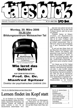 Er ist Professor für Psychiatrie, Doktor der Medizin, Doktor der Philosophie, diplomierter Psychologe und Ärztlicher Direktor der Psychiatrischen Uniklinik in Ulm. Er ist Deutschlands bekanntester Hirn-und Lernforscher. Und er kommt ins Bildungszentrum Weissacher Tal und wird als 30. Ehrengast am 20. März um 19.30 Uhr auf dem Roten Stuhl Platz nehmen. Seit über zwei Jahren hat sich die SPD Weissacher Tal um den Ulmer Professor bemüht, jetzt hat es endlich geklappt. Professor Spitzer ist Wissenschaftler und Bestsellerautor zugleich. Er hat die Fähigkeit - und dies ist für einen Professor nicht selbstverständlich - komplizierte Dinge einfach auszudrücken. Dies erklärt auch, warum er als Vortragsredner in ganz Deutschland die Säle füllt.