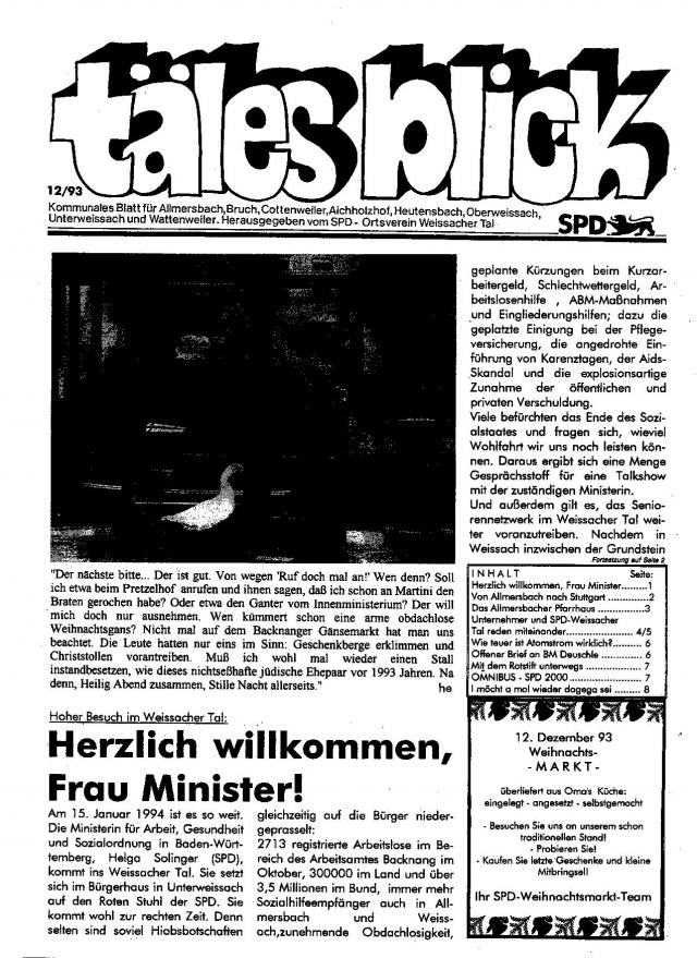 Am 15. Januar 1994 ist soweit. Die Ministerin für Arbeit, Gesundheit und Sozialordnung in Baden-Württemberg, Helga Solinger (SPD) kommt ins Weissacher Tal. Sie setzt sich im BÜrgerhaus in Unterweissach auf den Roten Stuhl der SPD. Sie kommt wohl zur rechten Zeit. Denn selten sind soviel Hiobsbotschaften gleichzeitig auf die Bürger niedergeprasselt.
